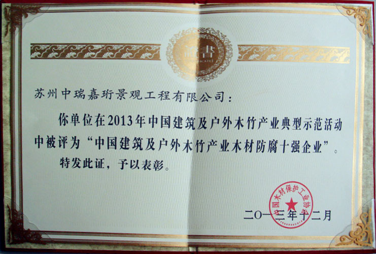 2013年在《中國木材保護工業協會》的組織下,我公司榮獲本年度防腐木企業評選《防腐木材企業十強》稱號。